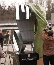 révolutionnairement. Cette oeuvre va à contre-courant, elle est ambitieuse et peut-être gênante. Mais le but est l'embellissement de la ville de Boudry. Et, qu'on