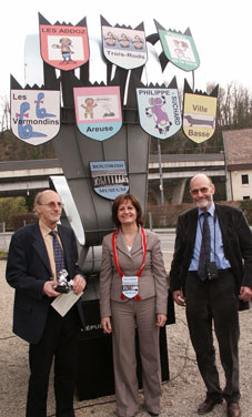 ![]() Devant la statue 2007: entourant Gisèle Ory, Pierre-Henri Béguin, Président du Musée de l'Areuse et Albert Rossetti, artiste, auteur de la statue |