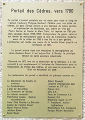 Yves Aubry Président du Conseil communal de la ville de Boudry, est heureux qu'après 35 ans d’attente, soit depuis la construction des locatifs des Cèdres, la promesse des promoteurs de l’époque, non tenue, est maintenant réalisée grâce à l’Association pour la restauration du Portail des Cèdres. Le portail trône maintenant entre un musée, une salle de spectacles et un magnifique collège. Il relève que c'est vraiment ici, à l’entrée du jardin de Voujeaucourt, ville avec laquelle Boudry est jumelée depuis la date de la démolition du portail, qu'il a sa place. La Ville remercie tous ceux qui ont permis de réaliser le but de l’Association, ainsi que les services communaux qui ont également participé à l’aboutissement du projet. |