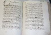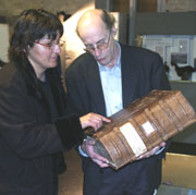 Annette Combe explique quelques détails de la couverture de ce livre de textes "cadastraux" à Pierre-Henri Béguin. |