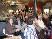 Sous le regard bienveillant de notre orignal, la foule se presse pour assister à cette veillée. Des chaises sont placées jusque dans le moindre recoin! |