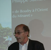 Laurent Nebel raconte l'histoire du Minaret: Philippe Suchard (1797-1884) a fait construire la maison aux environs de 1840 (rue Guillaume-Farel 11). Le Minaret a été ajouté ultérieurement (1865-1870). Les bow-windows (oriels) en fer Eiffel sont venus compléter l'édifice en 1890, soit après la mort de Philippe Suchard. Au décès de Philippe Suchard, Karl Russ-Suchard, époux de Eugénie Suchard, reprend la gestion de la fabrique de chocolat et s'installe au Minaret. Vers 1915, au décès de Eugénie, il construisit la Villa Eugénie à côté de l'Ecole de droguerie (cette villa a été détruite au début des années 1960 pour laisser la place à un immeuble locatif). Willy Russ, fils de Karl et de Eugénie, succède à son père à la tête de la fabrique et habite le Minaret jusqu'en 1925. Extrêmement sensible à l'art, il a accueilli dans cette maison tout ce que la Suisse comptait de peintres à cette époque, en particulier Ferdinand Hodler et Félix Vallotton. Au décès de Karl Russ, Willy s'installe à la Villa Eugénie et son frère Herrmann vient au Minaret. Très discret, grand ami des animaux, il érige dans le parc une multitude de volières et d'enclos: il faut dire que la propriété s'étendait de la rue du Clos-de-Serrières au lac et jusqu'au carrefour avec la rue Pierre-de-Vingle environ. En 1942, au décès de Hermann Russ, la propriété est morcelée en trois parties. Le Minaret, d'abord destiné à disparaître pour permettre la construction d'un home pour personnes âgées (ce qui n'a pas été possible en raison de la configuration pentue du terrain), est repris par un entrepreneur pour loger ses ouvriers: une cuisine est installée dans le local, un évier dans une des tourelles, la coupole centrale est fermée par une plaque d'éternit, des fils électriques sont tirés à travers les peintures murales. Par chance, personne n'a l'idée de couvrir de peinture acrylique les motifs orientaux! Mais les dégâts dus à l'humidité sont importants. «Cest le comble du luxe de vouloir rénover pareil monument! Ça coûte cher et ça ne sert à rien. Mais quand on aime, on ne compte pas» conclut Laurent Nebel. |