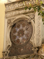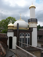 Michel Muttner raconte les différentes étapes de la restauration des coupoles: Il s'agit d'une reconstitution à partir des fragments d'éléments originaux encore existants. C'est un travail d'une complexité énorme. Les artisans capables d'accomplir de tels travaux ne sont pas légion! A l'origine, les bulbes étaient en zinc: le choix de ce matériaux était probablement dû à sa grande malléabilité; mais le zinc se corrode et tombe en poussière! Ils ont donc été refaits en cuivre. La coupole principale a un diamètre d'environ trois mètres et un poids de 700 kg. Les petites coupoles ont été dorées à la feuille (une feuille d'or a 5x5 cm et une épaisseur d'un micron), la grande peinte en blanc pour réfléchir au maximum la chaleur en été. Les motifs peints à l'intérieur de la coupole centrale ont été reconstitués à partir de relevés sur des films plastiques: étant donné l'état des lieux, ce fut un travail de bénédictin! |
