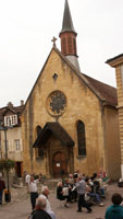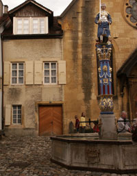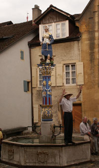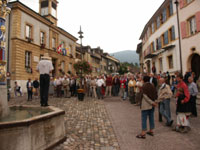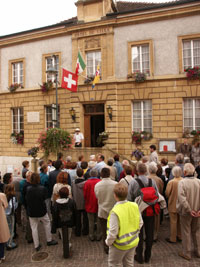 Le groupe s'est ensuite déplacé jusqu'à l'Hôtel-de-Ville, à nouveau accueilli par les accordéonistes. Là, nous avons appris comment Oscar Huguenin est arrivé à Boudry et la difficulté qu'il a eu à y être accepté, puisqu'il n'offrait pas de vigne!