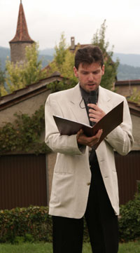 Pierre-Henri Béguin, Président de la Société du Musée de l'Areuse, salue les invités, autorités communales, cantonales, et se réjouit de pouvoir accueillir pour cette fête Madame Anne-Marie Rittershaus, petite-fille d'Oscar Huguenin. |