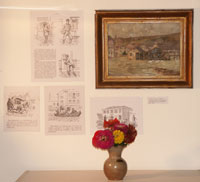 Dans l'atelier où se trouve le plafond peint cité ci-dessus, une petite exposition présentait l'inondation à laquelle Oscar Huguenin a assisté, qu'il a décrite dans un livre et dessinée sur un tableau:
