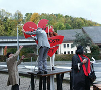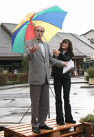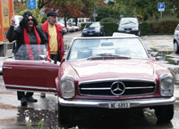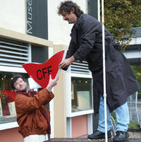 Mais voici que notre hôte de marque arrive, dans une somptueuse mercédès... Dans son discours, notre chère Nelly Wenger nous a révélé que les chiffres étaient son point fort. Elle a également avoué avoir posé un compteur de visiteurs sur l'arteplage du Musée de l'Areuse, ce qui lui permet d'annoncer aujourd'hui que cet arteplage a été visité par plus de 6 millions de personnes. Eh oui! avec un passage de plus de 5000 voitures par jour devant cet arteplage, en tenant compte que chaque voiture était occupée en moyenne par 5,5 personnes et que l'arteplage de Boudry a été placé le 1er avril déjà ... faites le compte!!! Devant un tel succès, Nelly a conseillé au Musée de l'Areuse de demander une rallonge (qu'elle avait apportée, enroulée autour de son bras!). |