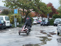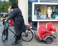 La démolition terminée, Nelly s'en est allée ... portant dans ses mains, comme pour se rassurer, sa petite mascotte Lily. Mais, plus de mercédès: le luxe n'a plus cours!! Le Musée de l'Areuse lui a offert un bon vieux vélo militaire, auquel était attelée une remorque contenant les reliques de l'arteplage de Boudry!! |