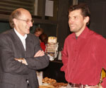 Le président de la Société du Musée de l'Areuse félicitant l'orateur de la soirée, Eddy Jaquet. |